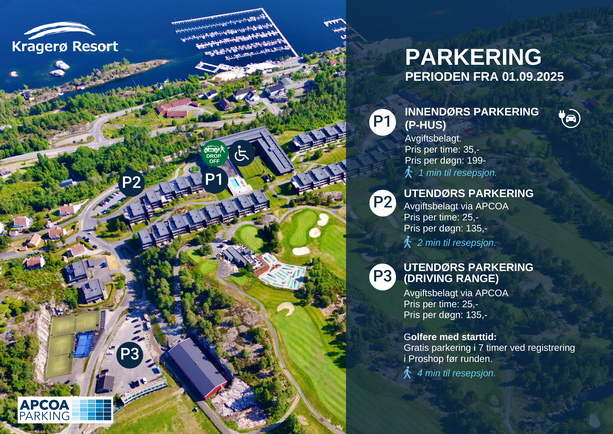 NB: Alle medlemmer kan henvende seg til Proshop for inntil 7 timer gratis parkering før starten av en spillerunde. Gjelder kun på området P3 / Driving Range. All parkering utover 7 timer er mot avgift. Du kan parkere først, og gi beskjed til en ansatt i Proshop ved registrering av din spillerunde. Er du i tvil om du har parker over 7 timer, kan du alltids kontrollere dette ved å taste inn ditt registreringsnummer på automaten for å se om du har en utestående parkeringsavgift.